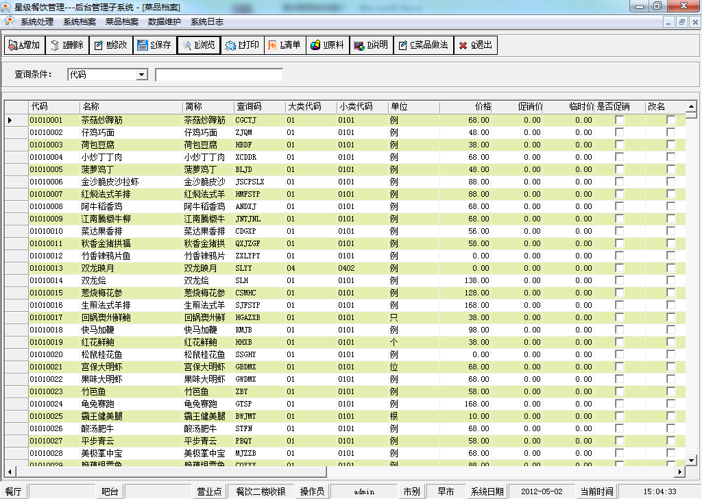 后台系统是餐饮管理的控制中心。在系统中可以增加操作员、操作组、货物等全部档案,而且对于各种档案进行修改、删除等管理;针对不同的客户要求,对基本信息、数据库设置等系统参数的设置也在本系统中进行;对于过期数据和过期档案可以进行系统初始化操作,以减轻系统负担,提高工作效率;操作日志记录了任何人、任何时间的任何操作,在出现问题后都可以操作日志中查询到满意的结果;对不同的操作员、操作组使用各子系统的权限进行分配,使系统的安全性、针对性更强;对数据库的维护是此子系统中重要的一个方面,因为所有的档案、操作均储存于数据库中,在此可对数据库进行备份、升级、还原等操作,极大的方便了对软件的管理。控制中心就是系统的心脏,而本系统的所有功能可以对功能强大的擎天餐饮管理系统进行全面的维护与管理。